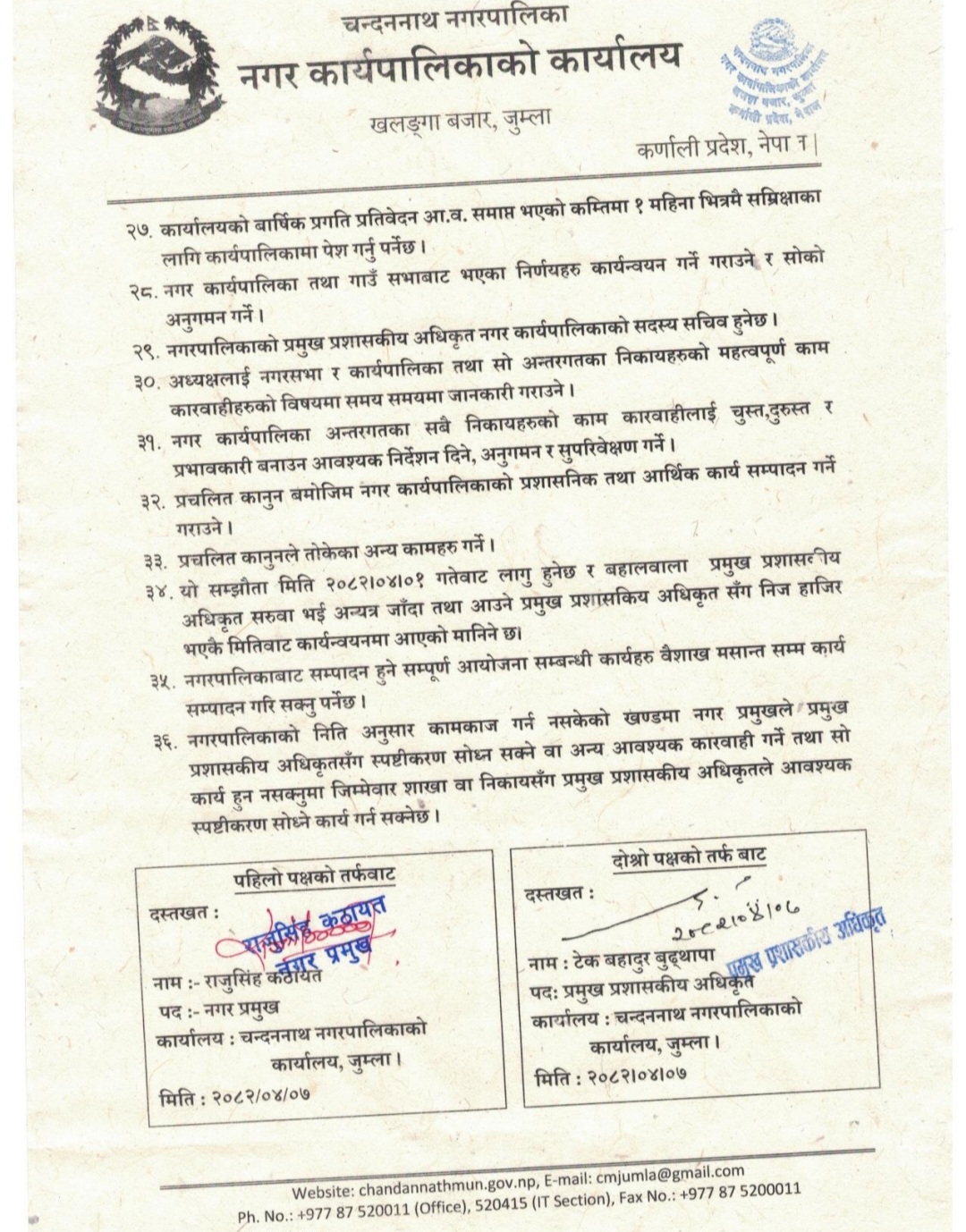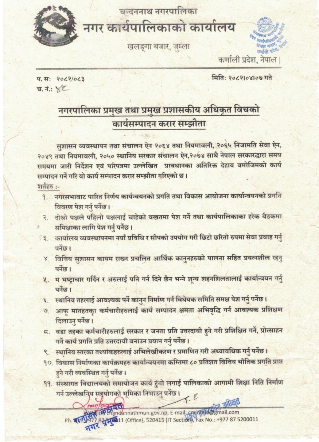 यस सम्झौता कार्यान्वयनमार्फत चन्दननाथ नगरपालिकाले सुशासन, जवाफदेहिता र प्रभावकारी सेवा प्रवाहमा नयाँ आयाम थप्ने अपेक्षा गरिएको छ ।