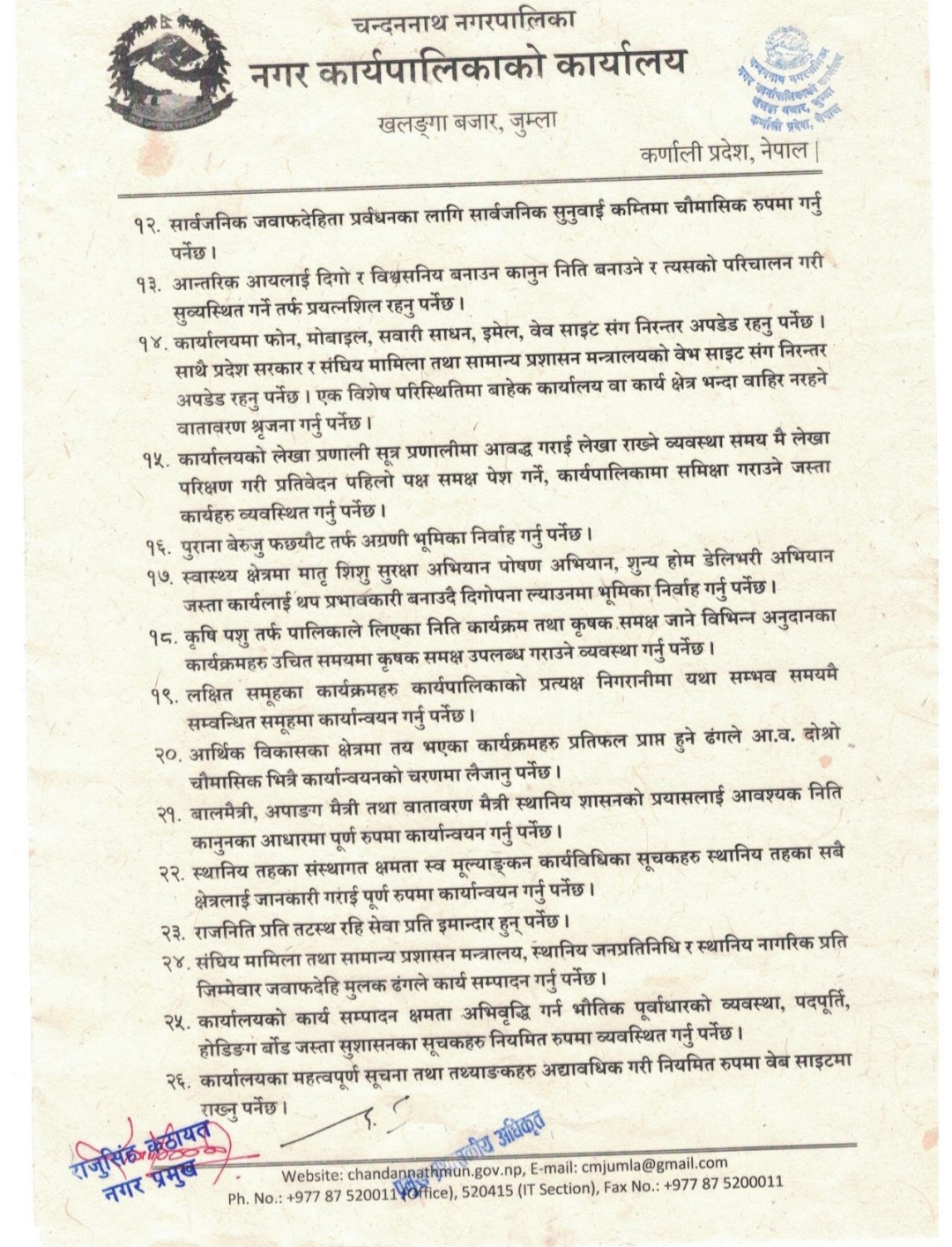 नगरपालिकाले सम्पादन गर्ने सबै आयोजनाहरू आगामी वैशाख मसान्तभित्र सम्पन्न गरिसक्नुपर्ने स्पष्ट प्रावधानसहित, नगर प्रमुखले नीतिअनुसार कार्य नगरेमा प्रमुख प्रशासकीय अधिकृतसँग स्पष्टिकरण माग्न सक्ने र सम्बन्धित शाखालाई आवश्यक निर्देशन दिने अधिकार सुरक्षित गरिएको छ ।