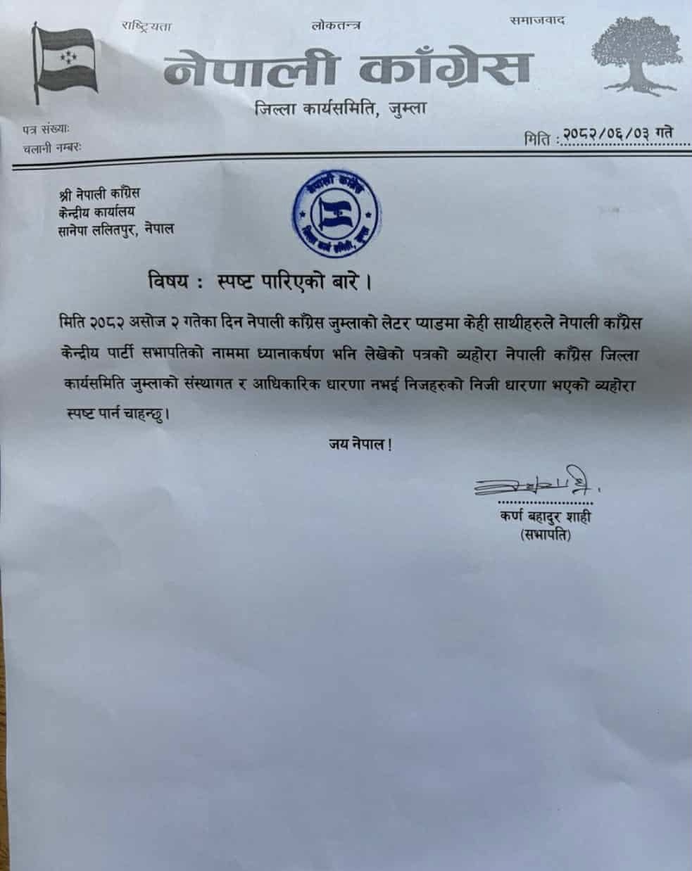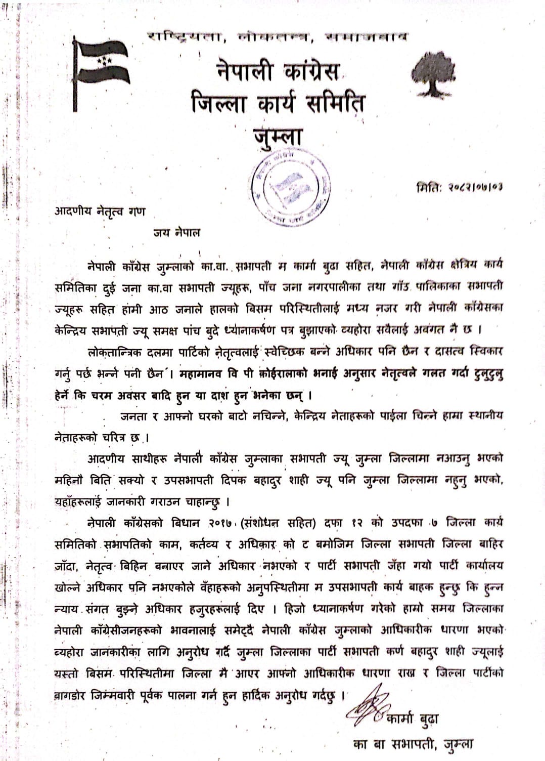 नेपाली कांग्रेस जुम्लामा केन्द्रीय सभापति शेरबहादुर देउवालाई लेखिएको ध्यानाकर्षण पत्रलाई लिएर जिल्लाभित्रै विवाद उत्पन्न भएको छ। जिल्ला कार्यसमिति सभापति कर्ण बहादुर शाहीले उक्त पत्रलाई आधिकारिक नभएको स्पष्ट पार्दै विज्ञप्ति जारी गरेका छन् भने कार्यवाहक सभापतिको जिम्मेवारी बहन गरेको दाबी गर्ने उपसभापति कार्मा बुढाले भने पत्र आधिकारिक भएको अडान लिएका छन्।
