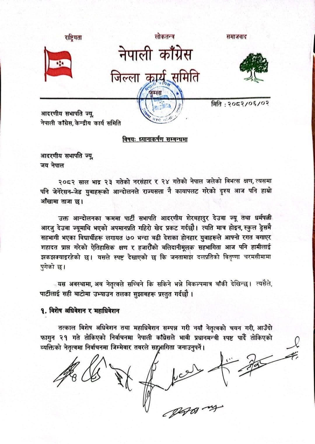 कांग्रेस जुम्लाको आधिकारिक लेटरप्याड प्रयोग गरी असोज २ गते देउवालाई पठाइएको पत्रमा तत्काल विशेष महाधिवेशन बोलाउनुपर्ने, एक व्यक्ति एक पदको सिद्धान्त कार्यान्वयन गर्नुपर्ने, दुई कार्यकालभन्दा बढी पदाधिकारीलाई पुनः उम्मेदवार बन्न नदिने व्यवस्थासहित नेताहरूको सम्पत्तिमाथि आन्तरिक छानबिन समिति गठन गर्नुपर्ने जस्ता मागहरू राखिएका थिए। फागुन २१ गते हुने प्रतिनिधि सभा निर्वाचनमा कांग्रेसलाई जिम्मेवारपूर्वक सहभागी गराउन नेतृत्व तहमै परिवर्तन आवश्यक रहेको भन्दै पत्रमा नयाँ नेतृत्व चयनका लागि दबाब सिर्जना गरिएको थियो।